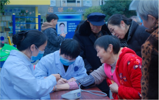 为社区老人测量血压