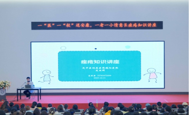 11日晚,医院皮肤科龙承鑫医生在德阳校区C203学术报告厅开展“痤疮知识讲座”。他系统解析了痤疮的分类分级、发病机制及防治措施,指出科学护肤与规范治疗的重要性,并介绍药物外治、口服药物、中医外治、物理治疗的治疗手段,强调从粉刺阶段、炎症阶段、丘疹脓疱到囊肿结节的阶段性治疗路径。龙医生还针对在场观众关注的如何护理痘痘、生理期和辛辣饮食对痘痘的影响、如何选择洁面产品、痘印修复及治疗周期等问题进行专业解答。